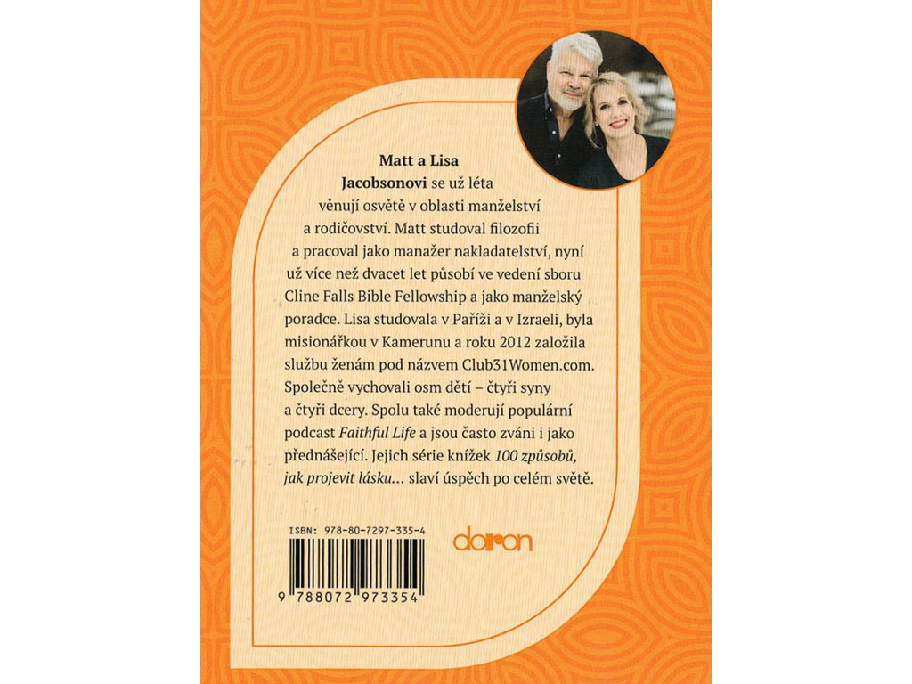 Matt a Lisa Jacobsonovi se už léta věnují osvětě v oblasti manželství a rodičovství. Matt studoval filozofii a pracoval jako manažer nakladatelství, nyní už více než dvacet let působí ve vedení sboru Cline Falls Bible Fellowship a jako manželský poradce. Lisa studovala v Paříži a v Izraeli, byla misionářkou v Kamerunu a roku 2012 založila službu ženám pod názvem Club31Women.com. Společně vychovali osm dětí – čtyři syny a čtyři dcery. Spolu také moderují populární podcast Faithful Life a jsou často zváni i jako přednášející. Jejich série knížek 100 způsobů, jak projevit lásku… slaví úspěch po celém světě.