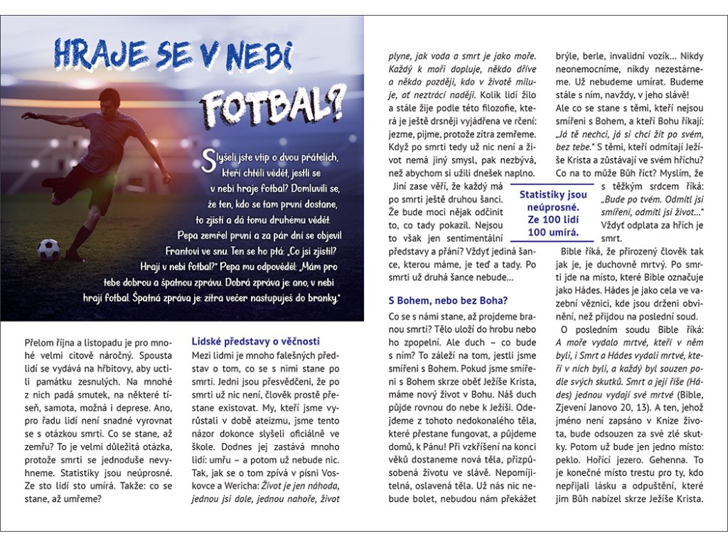 Slyšeli jste vtip o dvou přátelích, kteří chtěli vědět, jestli se v nebi hraje fotbal? Domluvili se, že ten, kdo se tam první dostane, to zjistí a dá tomu druhému vědět. Pepa zemřel první a za pár dní se objevil Frantovi ve snu. Ten se ho ptá: „Tak co jsi zjistil? Hrají v nebi fotbal?“ Pepa mu odpověděl: „Mám pro tebe dobrou a špatnou zprávu. Dobrá zpráva je: ano, v nebi hrají fotbal. Špatná zpráva je: zítra večer nastupuješ do branky!“