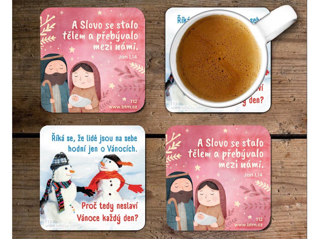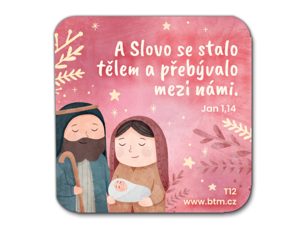 Laminovaný podtácek s obrázkem s tématem Vánoc a biblickým textem Lukáš 2,14
