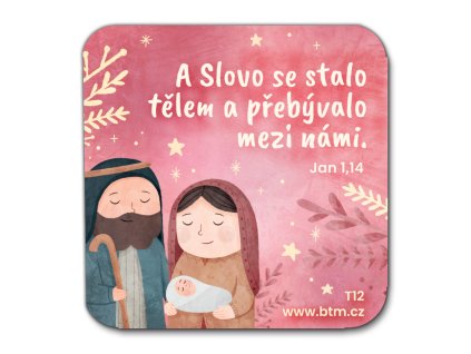 Laminovaný podtácek s obrázkem s tématem Vánoc a biblickým textem Lukáš 2,14 Velikost: 9 × 9 cm