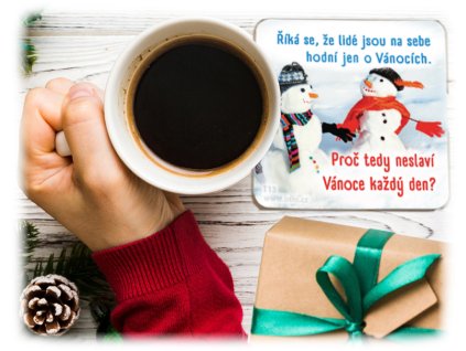 Laminovaný podtácek s obrázkem s obrázkem sněhuláků a textem: „Říká se, že lidé jsou na sebe hodní jen o Vánocích.“ – „Proč tedy neslaví Vánoce každý den?“ Rozměry...