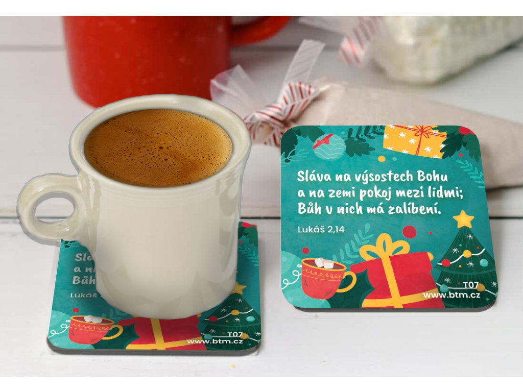 Laminovaný podtácek s obrázkem s tématem Vánoc a biblickým textem Lukáš 2,14