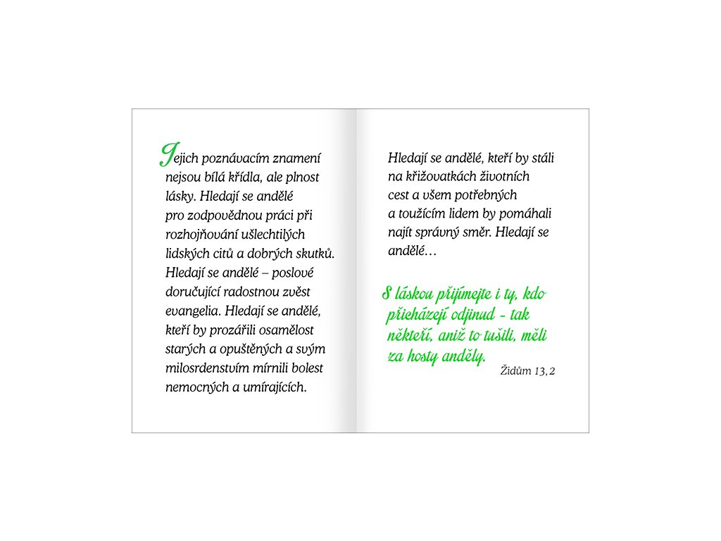 Jejich poznávacím znamením nejsou bílá křídla, ale plnost lásky. Hledají se andělé pro rozhojňování ušlechtilých lidských citů a dobrých skutků. Hledají se andělé, kteří by prozářili osamělost starých a opuštěných lidí a svým milosrdenstvím mírnili bolest nemocných a umírajících. Hledají se andělé – poslové doručující radostnou zvěst o záchraně člověka pro věčný život. Hledají se andělé, kteří by stáli na křižovatkách životních cest a všem hledajícím lidem by pomáhali najít správný směr. Hledají se andělé…