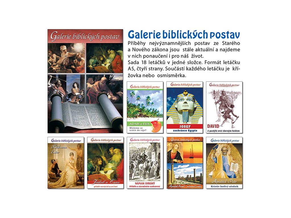 Kompletní sérii doposud vydaných letáčků řady „Galerie biblických postav“ nabízíme v pěkném obalu – složce s klopami, s možností vkládat nové letáčky této řady. Může také posloužit jako malý dárek. Složku s doposud vydanými tituly Vám nabízíme pod objednacím kódem HS1