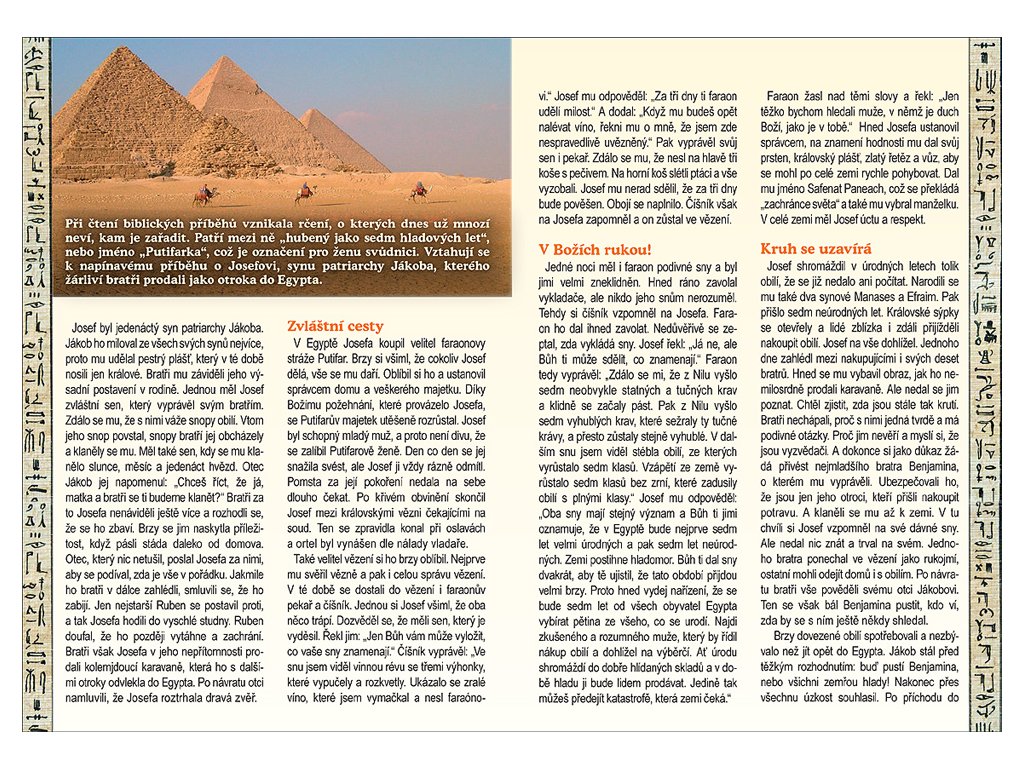 Josef žil podle historiků v období hyksóských faraónů (asi 1700 – 1500 př. Kr.). Jak vysoké postavení v Egyptské zemi zastával, najdete v tajence osmisměrky v tomto letáčku.